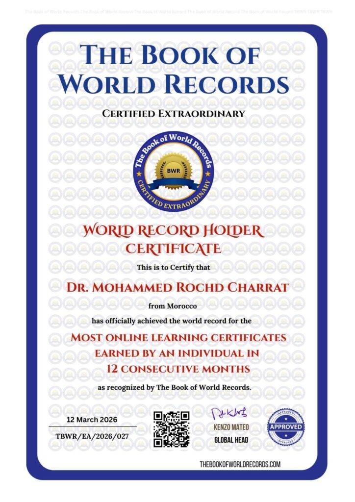 بفضل التفاني والانضباط والفضول الفكري الاستثنائي، حصل الدكتور شراط رسميًا على اعتراف كتاب الأرقام القياسية العالمية بإنجازه «أكثر شهادات تعلم عبر الإنترنت يحصل عليها فرد في 12 شهرًا متتاليًا».