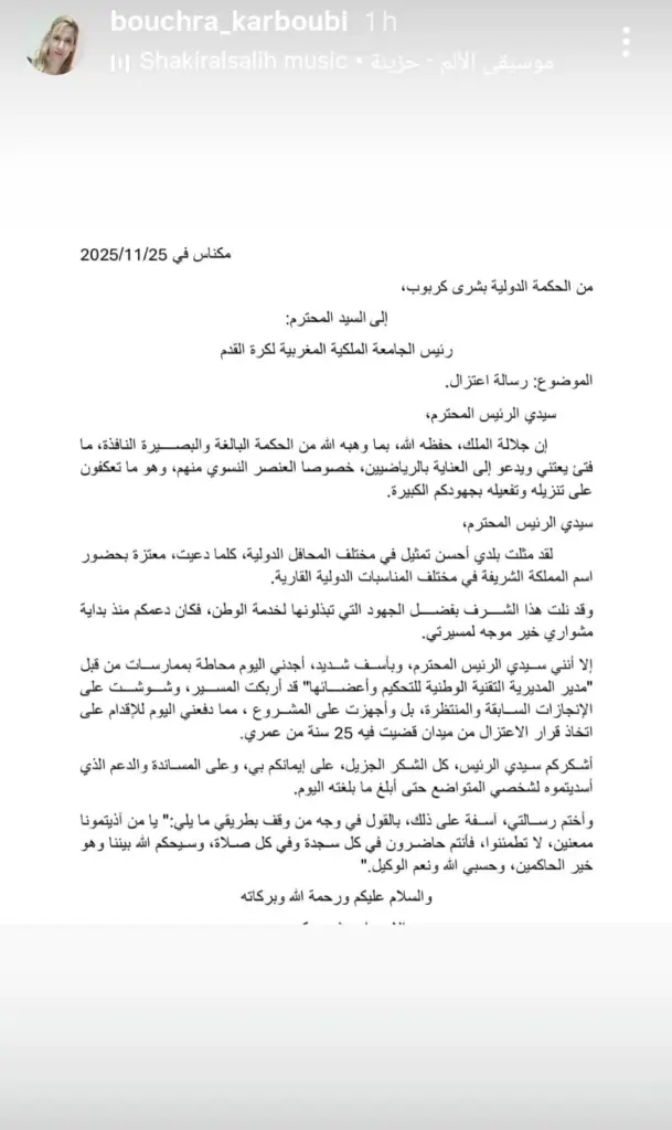 وأضافت أن تلك الظروف جعلتها تشعر أن الاستمرار لم يعد ممكنًا. لذلك قررت إنهاء مسار طويل، قضت خلاله سنوات في خدمة التحكيم المغربي داخل الوطن وخارجه.